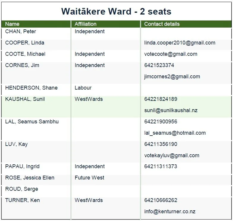 You will see from the tables below that there are a large number of candidates. The Piha R&R Committee notes that Sandra Coney has been a strong advocate for Piha, but has stepped down from the Waitākere Ranges Local Board. Piha needs strong representation. The committee does not endorse or recommend any particular candidates. However, for your information, we note that incumbent Board Members Mark Allen and Michelle Clayton have a history of supporting Piha, and Piha resident Hannah Slade is a new candidate standing for election. You may see fit to consider these candidates.